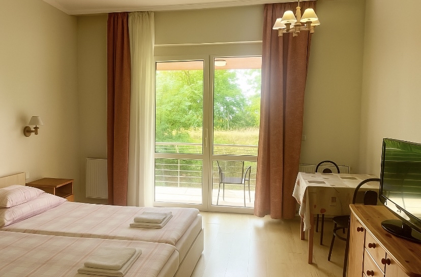 Motel 2 főre (5 db apartmanház) Az egy légterű konyha-étkező-szoba helyiségből, előtérből álló szállástípus fürdőszobái zuhanyzóval felszereltek. A motel szobák egymás mellett helyezkednek el, nyugati fekvésű terasszal rendelkeznek. Felár ellenében a légkondicionáló kapcsolható. Egy motel szoba akadálymentesített, 2 db összenyitható. A szállodától, fürdőtől 400 méterre találhatók.